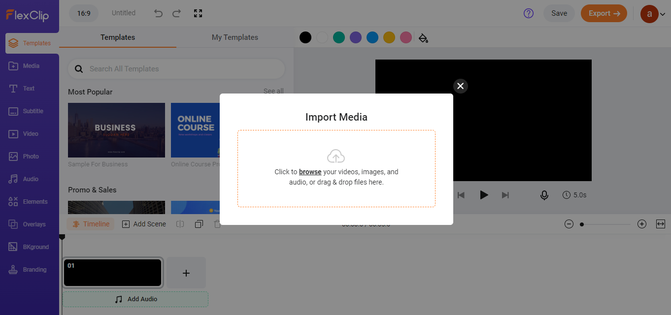 If you are satisfied with the select, you just need to select Get Started button. FlexClip displays a dashboard, which prompts you to import media files. You can either add photos, videos, and audio or close the dialog.