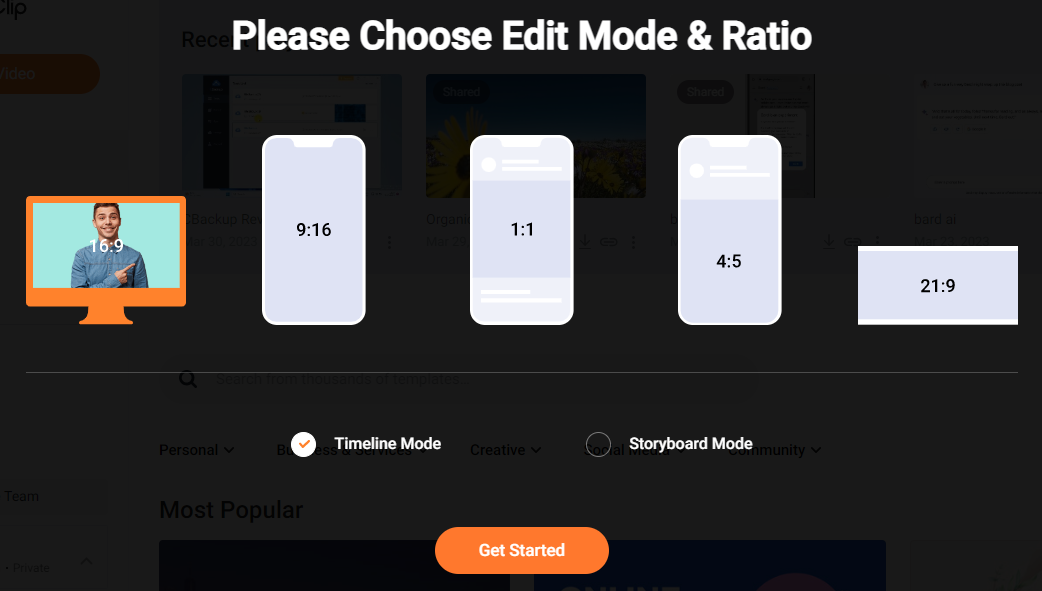 The next step is to select a ratio. If you need to create a normal video, you should select 16:9. If you would like to create YouTube Shorts video, you should select 9:16. FlexClip provides support for both Timeline and Storyboard modes.