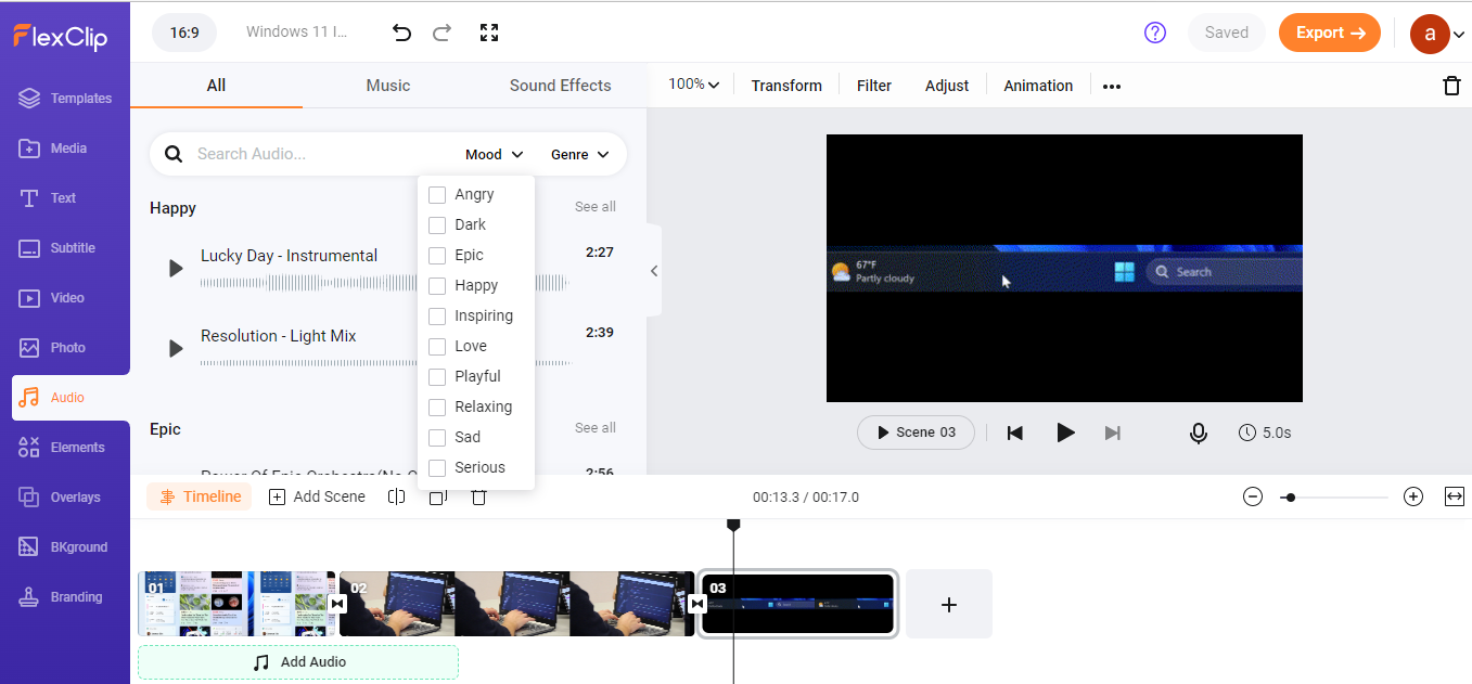 FlexClip comes with tons of stock audio content. You can filter audio by mood and genre. You can listen to the preview and the required timing will also be displayed.