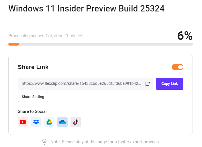 FlexClip provides the ability to render videos in 480p, 720p, and 1080p resolutions. The time required to generate the MP4 file depends upon the content included in the video. You can also generate GIF instead of videos. The app displays progress indicator during the production process. The final output will be downloaded immediately after the completion of the export.