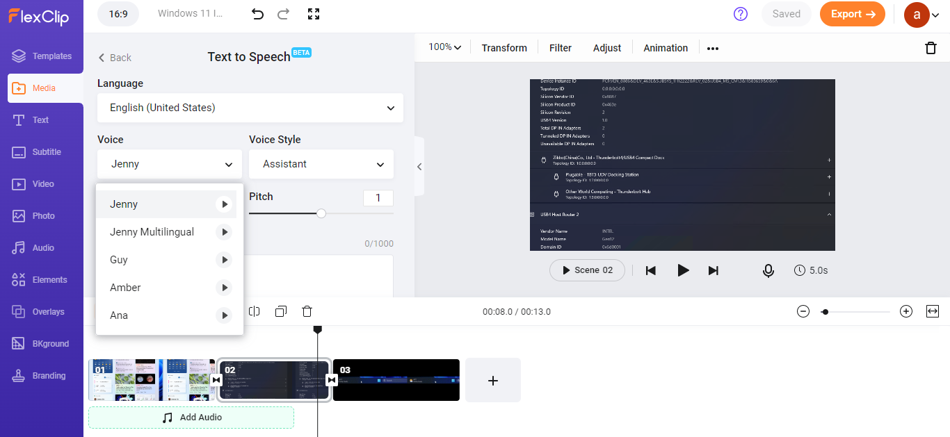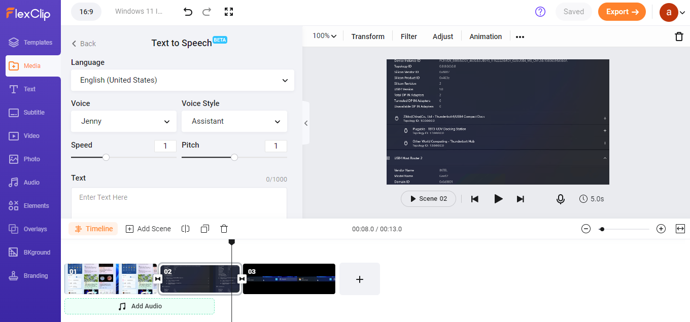 FlexClip ships with thousands of templates with all the text and music effects. These templates are royalty-free and can be used freely. The app includes a huge collection of text animations, elements, and transitions. The addition of resource-rich stock media assets provides an ability to create high-quality videos. You can trim/cut videos, add text, music, transitions, and watermark including recording screen from within the FlexClip dashboard. FlexCLip has integrated TTS support and hence you can create AI audio using your script. You can then use them on your projects. You need not have to perform any recording.