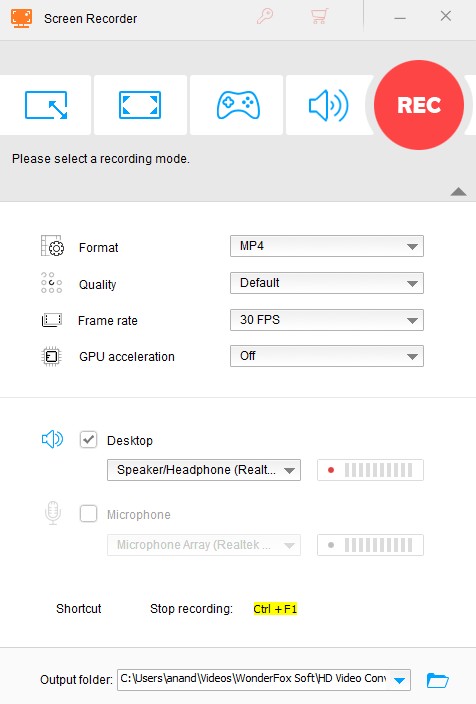 You should select Recorder icon to start the recording process. The parameters such as MP4, Quality, Frame rate, and GPU acceleration including microphone can be selected from the user interface.